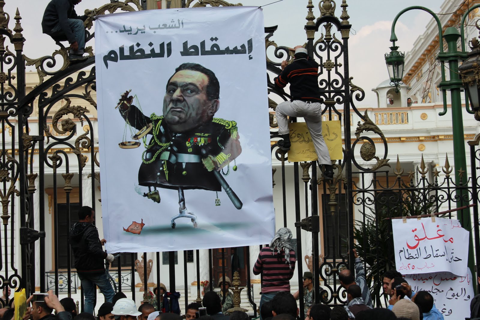 Protesters hang up a large banner mocking Dictator Mubarak upon the main gate of parliament. "People demand the removal of the regime" reads the sign.